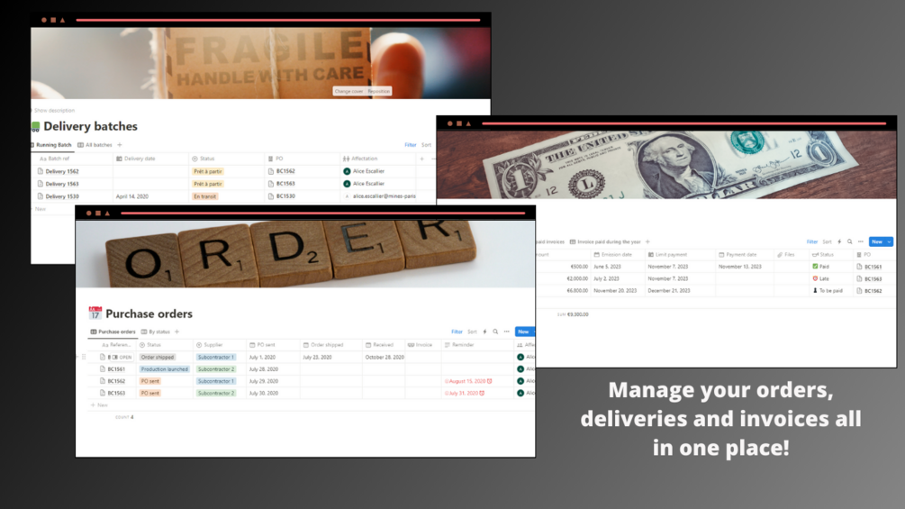 - Production: Manage your purchase orders, delivery batches and invoices;