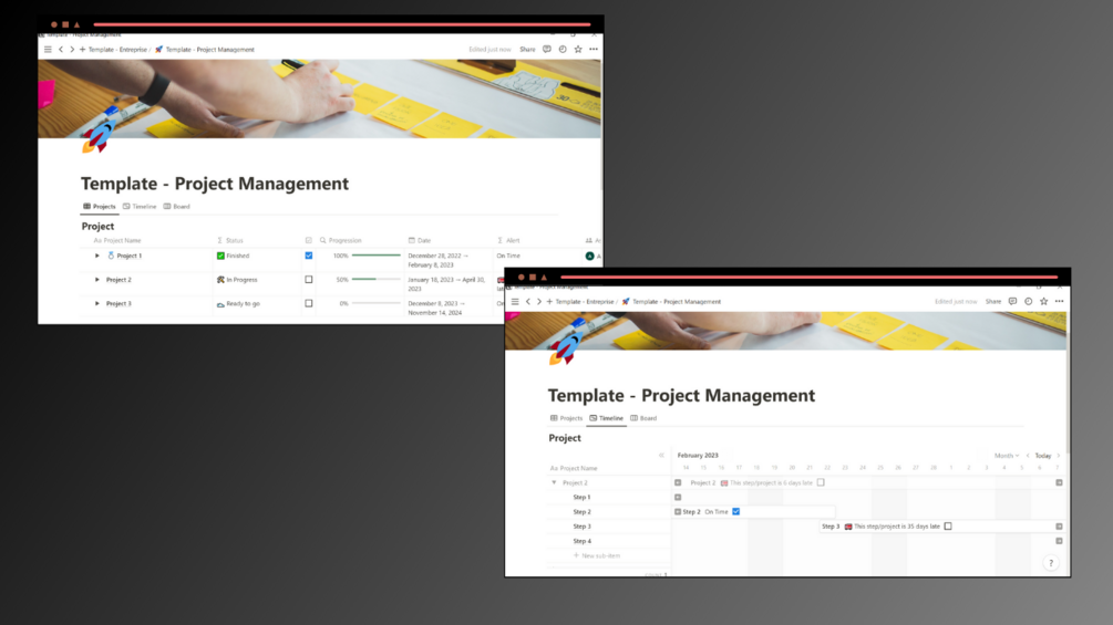 You can follow the progression thanks to the progression bar filled out automatically. You can create as many steps as you want for your projects and set up a deadline. When the deadline is crossed an alert message is displayed in the "Alert" column.