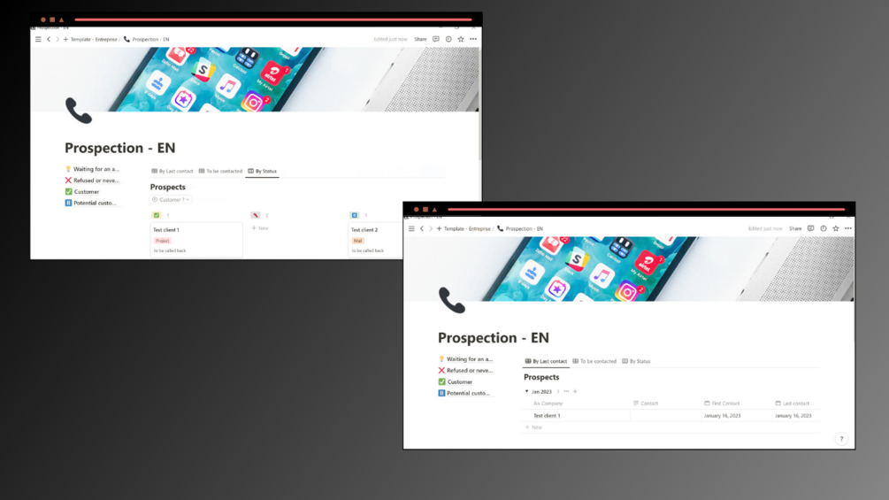This dashboard will help you mange your business prospection. Write down here all information about your prospectsand let Notion sort everything for you ! You’ll find 3 views :
